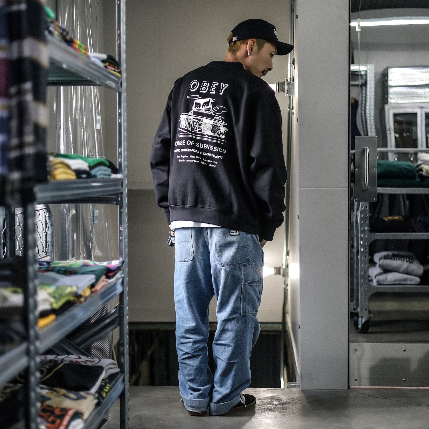街中にポスターやステッカーをゲリラ的に貼り付けていくという手法と共に、1989年にキャリアをスタートし、今ではストリートアート界の巨匠として知られる、Shepard Fairey ( シェパード・フェアリー )による、”OBEY”(オベイ)という名のアートプロジェクト。現在ではその活動は大きな広がりを見せ、MoMAやサンフランシスコ近代美術館などの世界中の美術館の常設展に作品が展示される程に。それ以外にも、世界各国において、大小様々なミューラル(街中における壁画)も手がけるなど、Shepard Faireyは紛れもなく、現代を代表するアーティストの一人であると言えるでしょう。アーティスト活動と並行して、彼のアートへのより身近なアクセス方法としてのアパレルラインである〈OBEY Clothing〉が2001年、アメリカのLAにて誕生いたしました。彼自身が過ごしてきた、スケートボードやパンク、ロックといった音楽カルチャーの影響を色濃く残し、なおかつアーティストとしてのShepard Faireyの持つポリティカルなスタンスをファッションとして昇華したラインナップは、誕生してから20年以上が経った今なお、全世界のユースを虜にし続けています。
